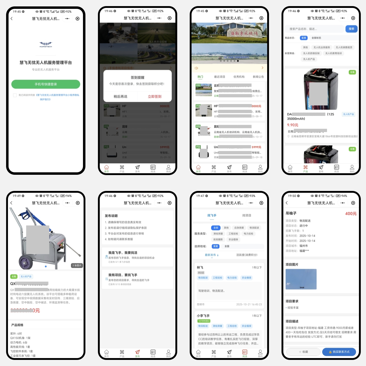 随着低空经济蓬勃发展,无人机行业面临 “项目方找飞手难、飞手接项目难” 的双重供需痛点。基于此,我们公司与云南慧飞无人机科技有限公司达成深度合作 —— 由我方提供全流程技术支持,云南慧飞负责内容运营,共同开发 “慧飞无忧无人机服务管理平台” 微信小程序,旨在搭建无人机厂商、项目方、飞手的三方高效对接桥梁。