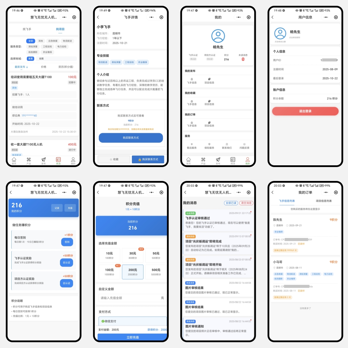 微信端针对无人机厂商、项目方、飞手三类核心用户,设计差异化功能模块,操作便捷且贴合行业场景。